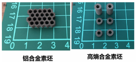 高熵合金AlCrFeNiCoCu 打印材料,工藝為將光固化樹脂與表面改性的高熵合金粉末混合,并添加光引發(fā)劑,通過特定波長的紫外光固化,制成產(chǎn)品坯體;此坯體在特殊的熱處理爐中通過脫脂工藝將樹脂成分去除,通過燒結(jié)工藝達到產(chǎn)品的致密化。
